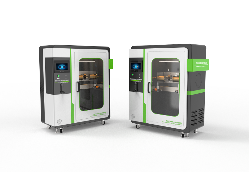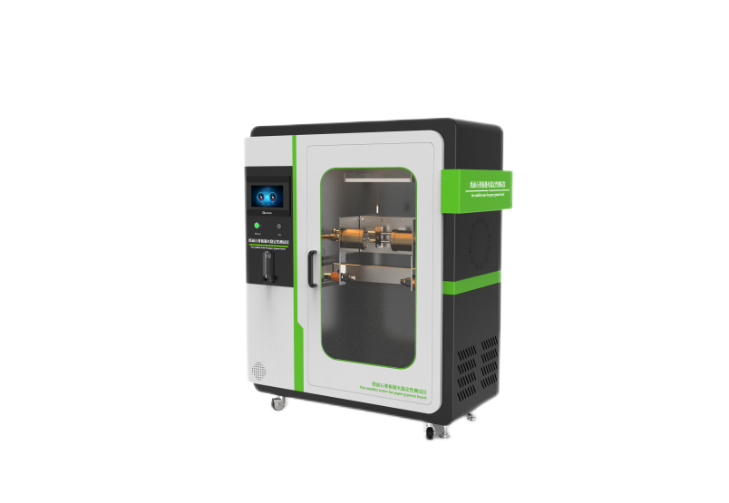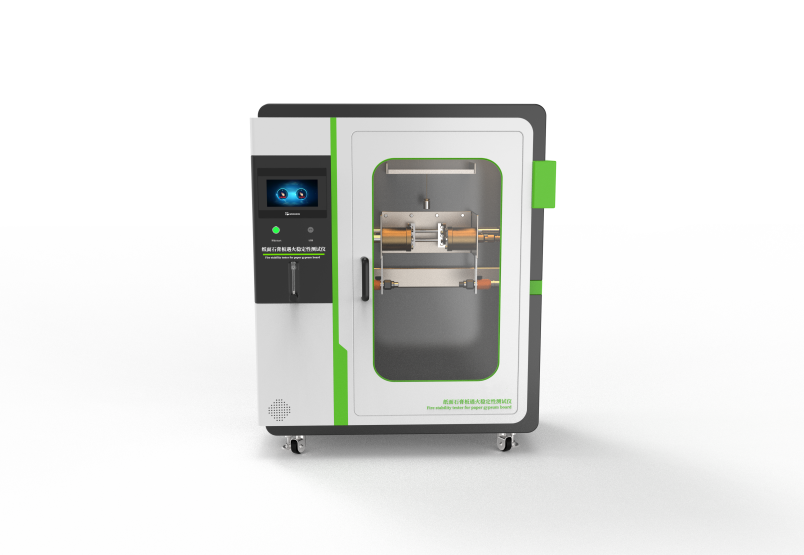 试验介绍:将试样钻孔并在规定环境条件下处理。用支杆将试样悬挂于两个喷火口中间,喷火口与试样表面垂直。用液化石油气作为热源向遇火稳定性测定仪的两只燃烧器供气,燃烧器喷火口距板面为30mm。按标准规定再试件下端悬挂荷载,点燃燃烧器。用热电偶在距离板面5mm处测量温度。试验初期应在不使试样晃动的情况下,去除掉落在热电偶上的已炭化的护面纸。 通过调节,在3min内把温度控制在(800±30)℃,试验过程中一直保持此温度。从试件遇火开始计时至试件断裂破坏。记录每个试件被烧断的时间,以五个试件中小值作为该组试样的遇火稳定性,精确至1min。