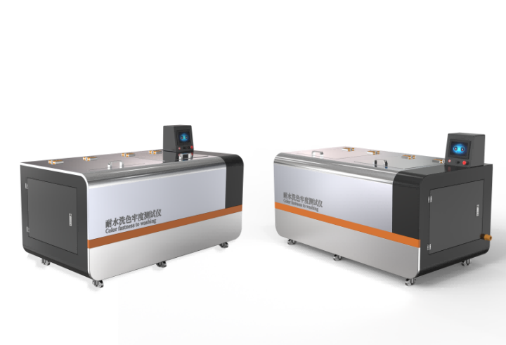 水洗色牢度测试仪的原理:试样与规定的标准贴衬织物缝合在一起,在一定温度和洗涤剂条件下进行洗涤,试样通过与洗涤剂及不锈钢珠的搅拌作用完成,再经清洗与干燥,然后用变色,沾色灰卡评定试样的变色和贴衬织物的沾色