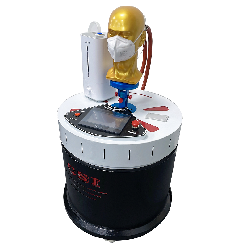 模拟穿戴预处理机,由呼吸模拟器、试验头模、饱和水蒸气发生装置、温度控制装置、 流量计等组成,可控制呼吸模拟器以25次/分钟,每次2L的呼吸量运行。可控制头模嘴巴附近饱和水蒸气的温度为(37+2) °。开启预处理装置,使呼吸装置及饱和水蒸气发生装置进入工作状态,直到达到稳定。将呼气器以气密的方式佩戴在匹配的试验头模上,测试20分钟左右。从呼吸器上取下颗粒物过滤材料,然后重新安装上去,继续重复测试10次。