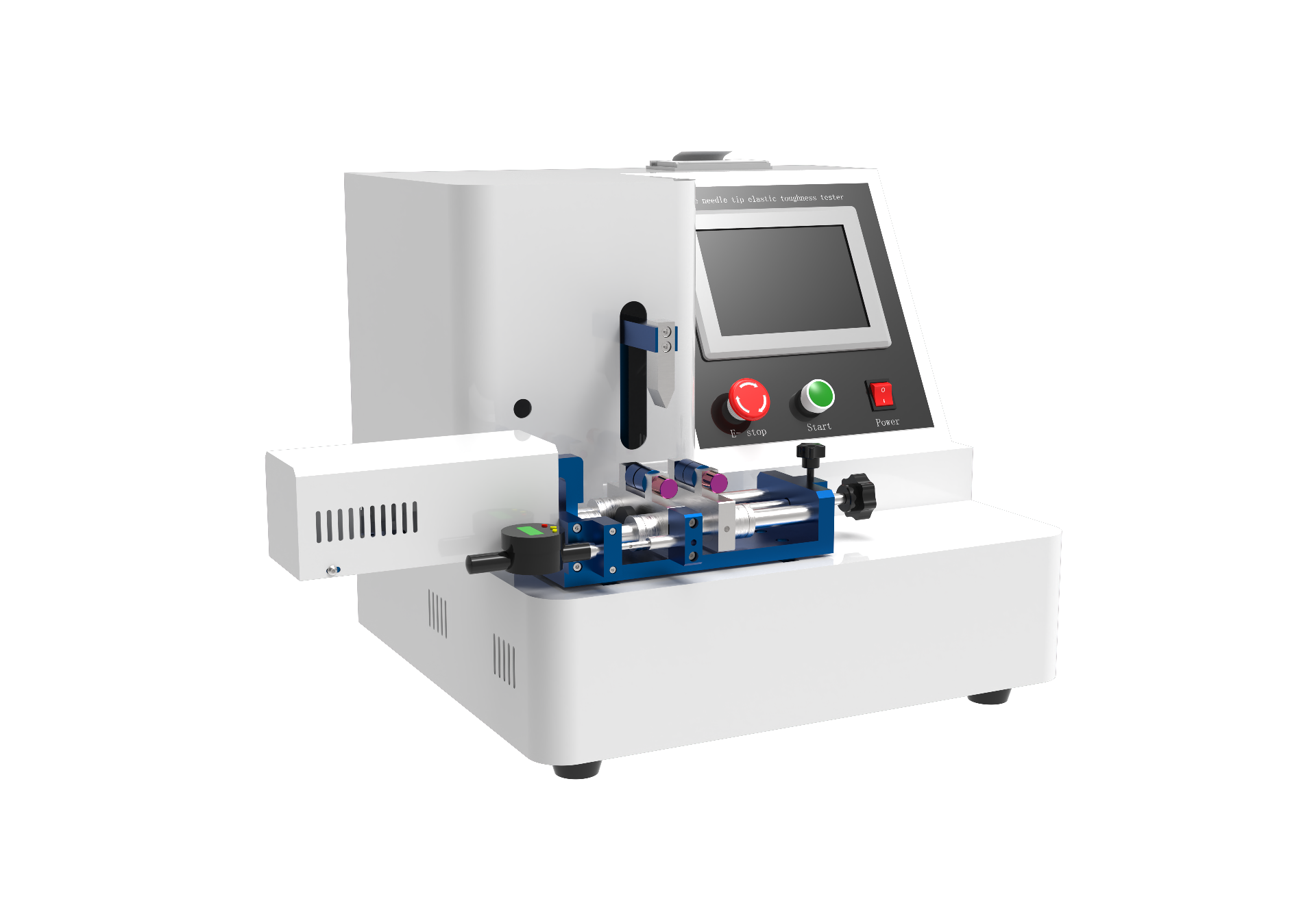 本设备是检验生产厂家产品性能的检测设备。由可编程控制器,触摸屏,力值传感器,传动装置,机载打印机等组成,提供中英文菜单显示,具备人机对话设定各项参数自动运行测试模式。另增设生产单位,生产批次机打输入,使测试结果更加规范化标准化。信息安全方面采用三级密码,让信息安全可靠。测试操控范围包括:测试项目、公称规格、弧形、缝针直径、玄长、打印设定、测试、上行、下行、时间、标定,检定等功能设定。搭配机载打印测试可实时显示弹性形变数据。针对测试结果自动判断,不合格则启动自动蜂鸣报警,并由打印机打印出测试数据及结果以供分析。