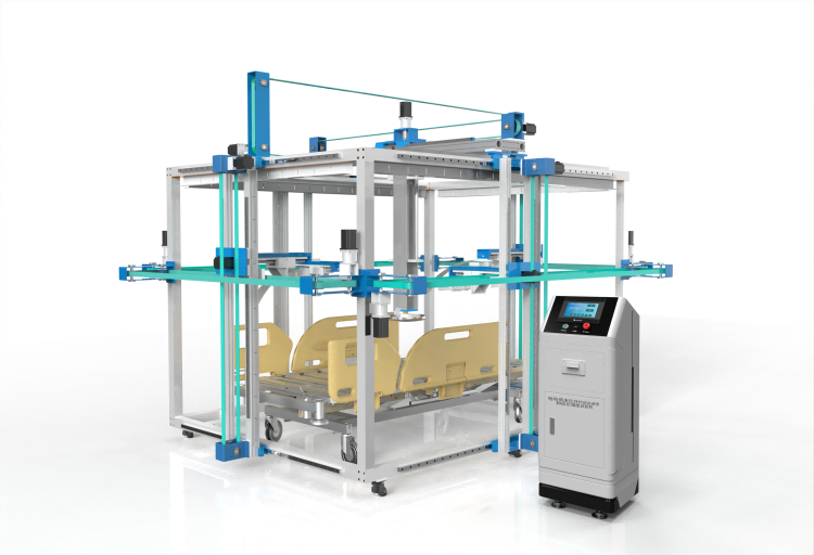 2. 可固定住电动病床,并对电动病床护栏的4个水平方向以及向下的垂直方向施加0-750N的力,步进不能大于5N,可自动循环工作,次数可设置,可设置次数应≥5000次。