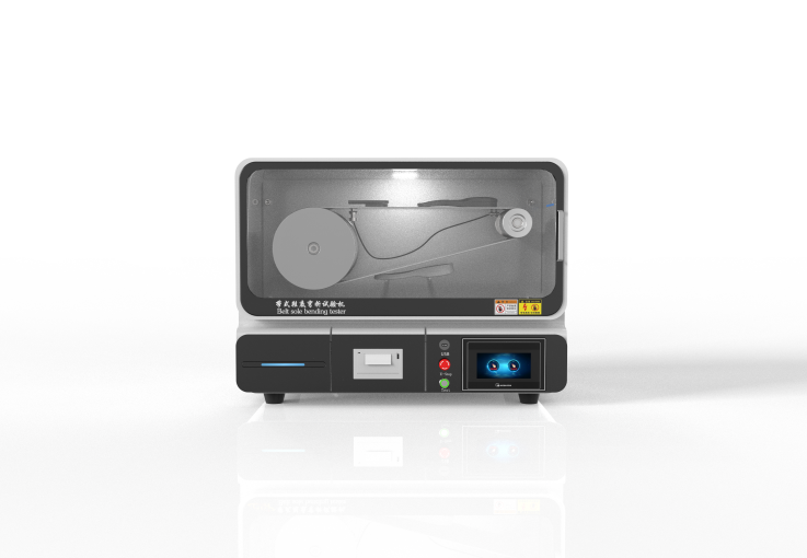 使用合适的胶水将测试试鞋底粘于皮带上,鞋底通过在BATA皮带耐曲折试验机的驱动轮带动皮带在选定的从动轮上模拟人实际穿着的状态进行曲折,一定曲折次数后,观察鞋底测试试片是否产生裂纹以及产生裂纹后其裂纹增长快慢的情况,以次来评估测试鞋底的耐曲折性能。