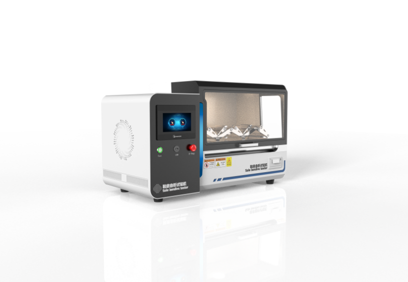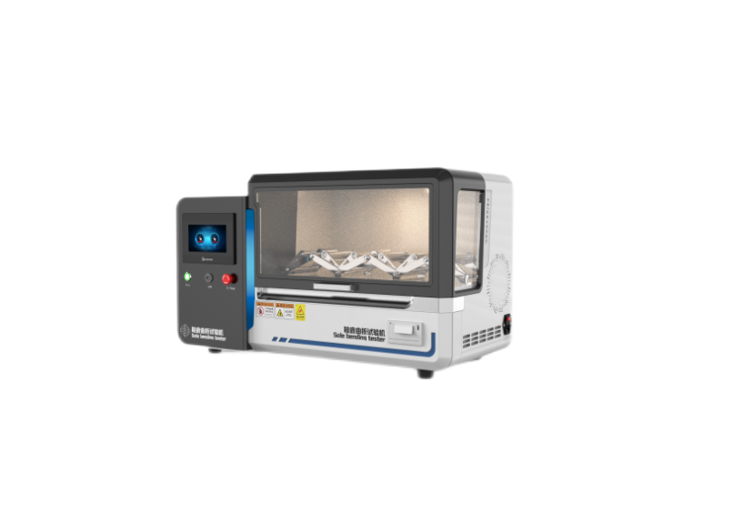 用于弯折鞋底,弯折一定次数后,以放大镜检视鞋底耐伸展程度,(先在鞋底测试时之最大弯折处,刺穿若干指定孔,然后以本机夹具固定鞋底两端,夹具一为固定,一为活动,测试时夹具中间之圆轴反复凸起)。本机具有断电记忆功能。