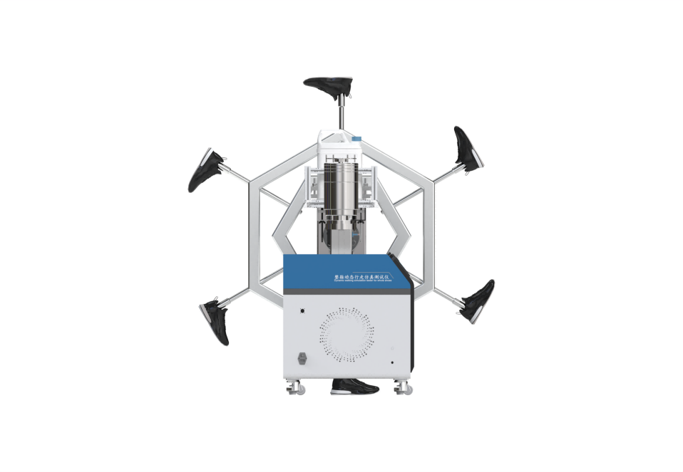 将成品鞋穿戴上仪器鞋楦上,通过旋转轴模仿人在正常行走,在连接杆接近行走架旁边增加荷载,通过程序设置行走过程的试验环境,来达到试验目的。